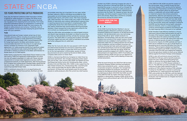 Another way NCBA is showing Congress the value of these tax provisions is through the NCBA Tax Survey . We launched this survey in July , and it will run through the end of 2023 . NCBA encourages all cattle producers to complete the survey to help us better understand how provisions like the Death Tax , stepped up basis , like-kind exchanges , and other programs support family-owned farms and ranches . Please take a moment to complete the survey by clicking the button below .