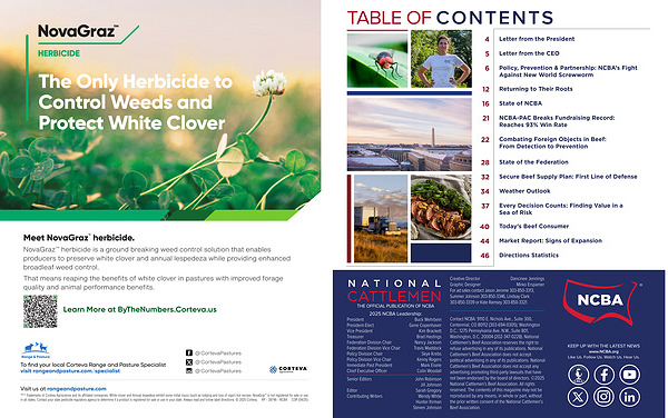 Contact NCBA: 9110 E. Nichols Ave., Suite 300, Centennial, CO 80112( 303-694-0305); Washington D. C.: 1275 Pennsylvania Ave. N. W., Suite 801, Washington, D. C. 20004( 202-347-0228). National Cattlemen’ s Beef Association reserves the right to refuse advertising in any of its publications. National Cattlemen’ s Beef Association does not accept political advertising in any of its publications. National Cattlemen’ s Beef Association does not accept any advertising promoting third-party lawsuits that have not been endorsed by the board of directors. © 2025 National Cattlemen’ s Beef Association. All rights reserved. The contents of this magazine may not be reproduced by any means, in whole or part, without the prior written consent of the National Cattlemen’ s Beef Association.