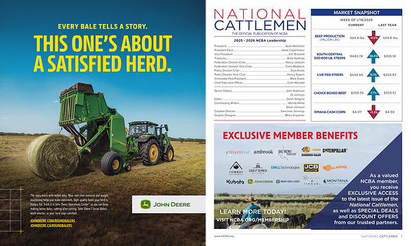 National Cattlemen( ISSN- 0885-7679) Copyright © 2026 by the National Cattlemen’ s Beef Association, is published monthly except for October by National Cattlemen’ s Beef Association, 6855 S. Dayton Street, Greenwood Village, Colorado 80155-2900.( 303) 694-0305. Periodical postage paid at Denver, Colorado. The annual dues for a National Cattlemen’ s Beef Association is $ 180, with a National Cattlemen subscription included in membership dues. POSTMASTER: POSTMASTER: Send address changes to National Cattlemen’ s Beef Association 9110 E. Nichols Ave., Suite 300, Centennial, Colorado 80112.