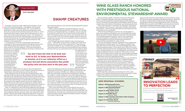 President Trump has made“ draining the swamp” a core piece of his political agenda.“ The Swamp” has become a popular moniker for Washington, D. C., and is meant to describe the dark, slimy and unsavory perceptions many have of our government and those who work within it. Those perceptions are rooted in what most Americans see in the news. As one who spent 20 years living in“ The Swamp,” the perceptions are not far off. However, there are some in the Trump administration who believe NCBA, and other agriculture trade associations, are swamp creatures and part of the problem. Let’ s explore this.