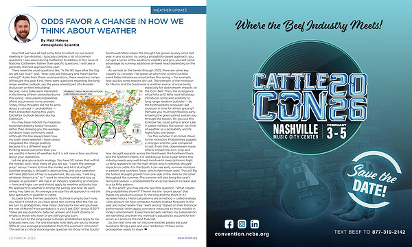There were the usual questions like , “ Is the 90 days after the fog we get rain true ?” and , “ How cold will February and March be for calving ?” Aside from those usual questions , there were two camps of thought this year . First , there were questions regarding the longrange weather outlook , say the years ahead ( part of a broader discussion on herd rebuilding ). Second , many folks were interested in the timing of their controlled burns this spring . I discussed probabilities of the occurrences in my answers . Today , those thoughts led me to write about a concept — probabilities — that I presented during this year ’ s CattleFax Outlook Session during CattleCon .