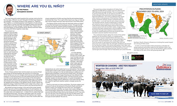 In a very general sense , Image 1 is the timing of an El Niño . We must consider , too , the other part which is the type of El Niño and its strength . I described what makes each El Niño event different in terms of where the warmest ocean temperatures are , which adds fuel to our atmosphere . The strength of that warm ocean is also a factor ( strength in terms of how much warmer than average it is ). We are talking about a difference of 1 degree Celsius between a strong versus weak event . The August National Cattlemen had images showing just how different the precipitation and temperature pattern can be across the country between weaker and stronger events ; it is quite remarkable to think about a degree Celsius difference in the ocean that far away can make for significant weather pattern changes across the country .