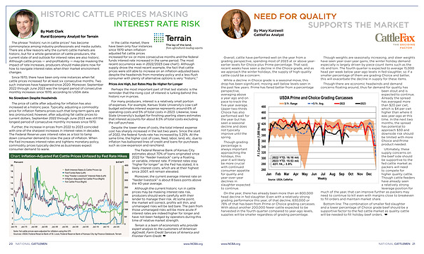 Overall , cattle have performed well on the year from a grading perspective , spending most of 2023 at or above yearearlier levels for Choice plus Prime percentage . That said , recent weeks have seen a decline in the Choice grade , and as we approach the winter holidays , the supply of high-quality cattle could be a concern .