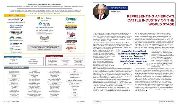 Traveling to these overseas meetings always reminds me why it ’ s so important to fight for the cattle industry here in the U . S . Antiagriculture misinformation runs rampant in Europe and other parts of the world where activists drive politicians to push non-scientific , anti-agriculture regulations in the name of protecting the climate or improving animal welfare . That could be our fate if we fail to engage . Attending international forums and keeping constant pressure on Congress is vital to our work as an organization in protecting your farm or ranch . NCBA was the only U . S . cattle organization in attendance at the World Meat Congress and the only organization with a prospective of the cattle producers and feeders . If we bury our heads in the sand and say what happens in the rest of the world doesn ’ t matter , we will become irrelevant in shaping world opinions . I , for one , would rather be at the table than on the menu .