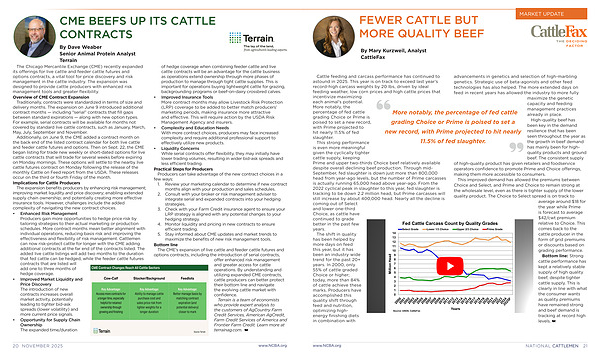 Cattle feeding and carcass performance has continued to astound in 2025. This year is on track to exceed last year’ s record-high carcass weights by 20 lbs, driven by ideal feeding weather, low corn prices and high cattle prices that incentivize maximizing each animal’ s potential. More notably, the percentage of fed cattle grading Choice or Prime is poised to set a new record, with Prime projected to hit nearly 11.5 % of fed slaughter.