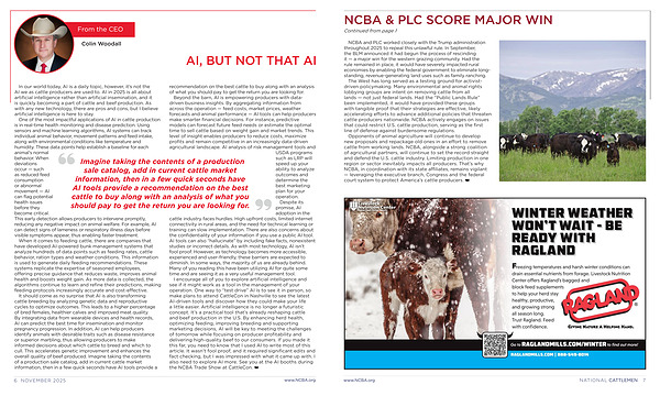 I encourage all of you to explore artificial intelligence and see if it might work as a tool in the management of your operation. One way to“ test drive” AI is to see it in person, so make plans to attend CattleCon in Nashville to see the latest AI-driven tools and discover how they could make your life a little easier. Artificial intelligence is no longer a futuristic concept. It’ s a practical tool that’ s already reshaping cattle and beef production in the U. S. By enhancing herd health, optimizing feeding, improving breeding and supporting marketing decisions, AI will be key to meeting the challenges of tomorrow while focusing on producer profitability and delivering high-quality beef to our consumers. If you made it this far, you need to know that I used AI to write most of this article. It wasn’ t fool proof, and it required significant edits and fact checking, but I was impressed with what it came up with. I also need to explore AI more. See you at the AI booths during the NCBA Trade Show at CattleCon.